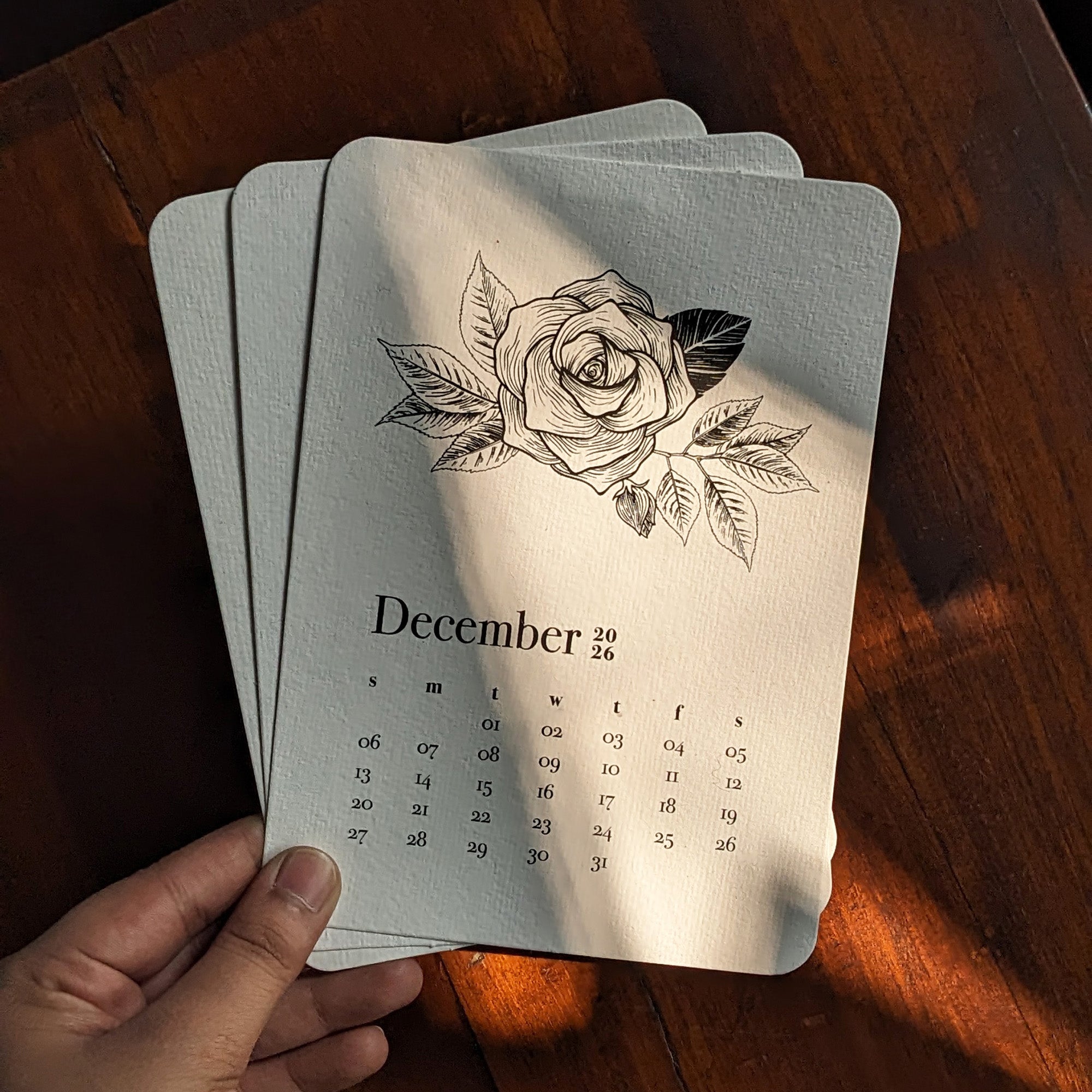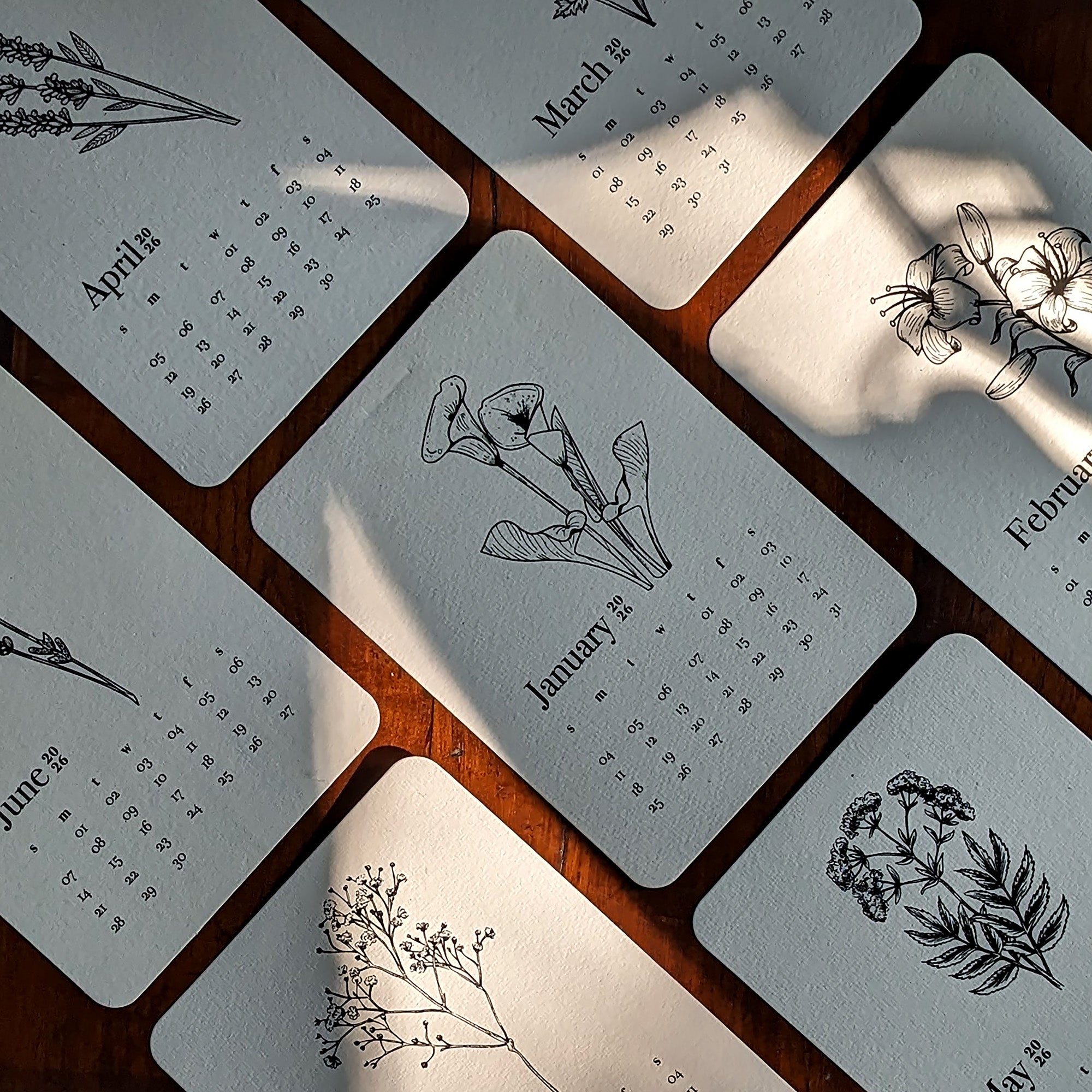 a compact desk calendar held by a simple clip on a sturdy wooden easel stand, featuring delightful floral illustrations on either a white or colored base. Also available in a fun hobby paint-it-yourself option for a personalized touch.